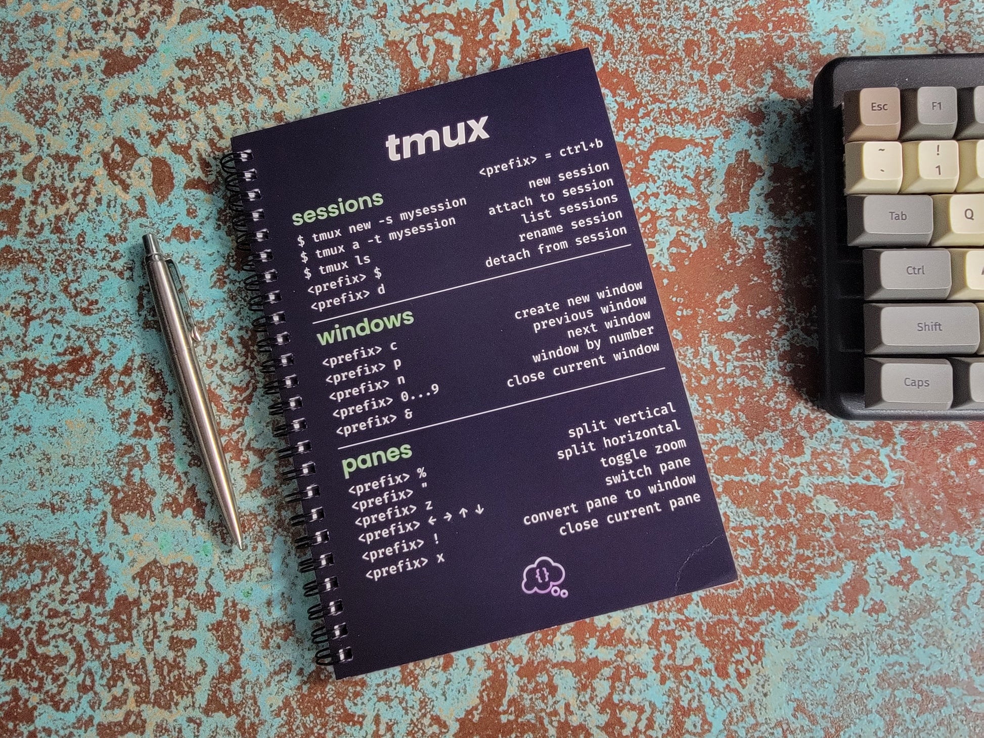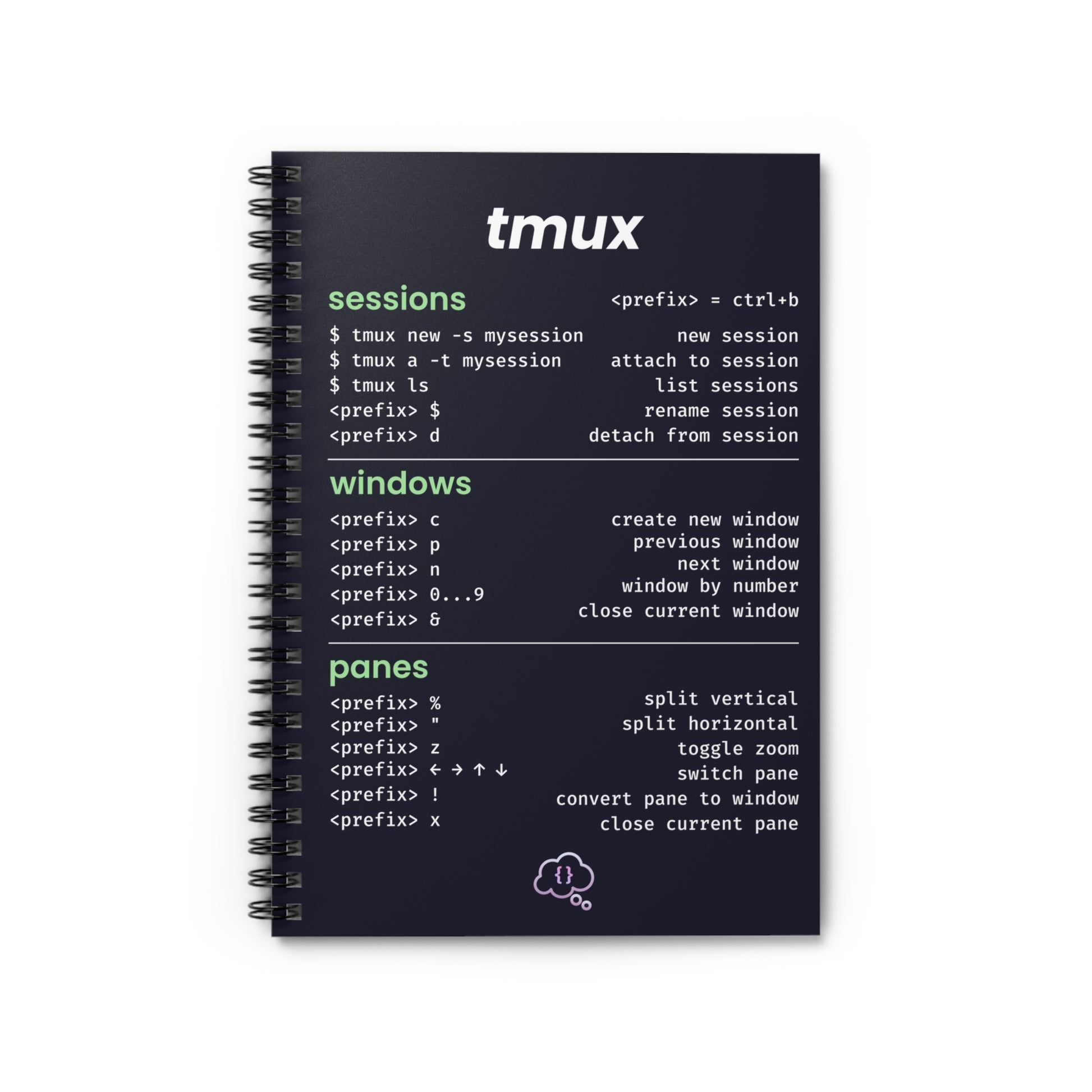 This 2 in 1 notebook and cheatsheet is perfect for helping you take notes whilst learning to code. The front cover acts as a tmux cheatsheet ensuring you always have a reference guide to hand for the most commonly used commands.
